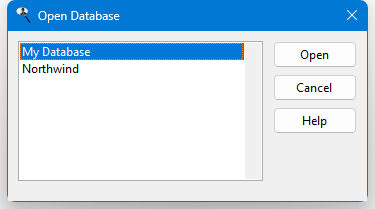 If you have more than one database available, you can select which database you want to report on when you log in; the default is the one you chose the last time you used Stonefield Query. At any time, you can switch to a different database by selecting the Open Database function from the File menu to display the Open Database dialog. Select the desired database and choose OK. If the ribbon is displayed instead of the menu, click the Open Database button in the Data tab and select the desired database from the dropdown menu.