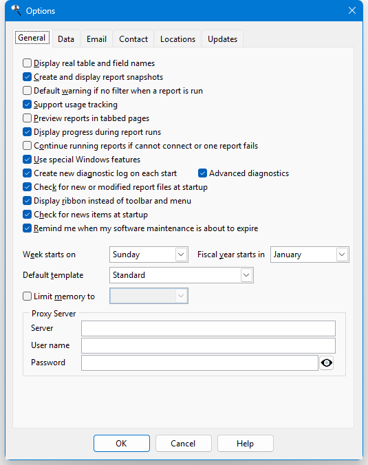 Proxy Server: if you use a proxy server to access the Internet, tell Stonefield Query about that server by filling in the Server, User name, and Password settings. The latter two aren't required if the user name and password aren't specified for the proxy server. Click the "show password" button toggle between displaying the password in plain text or as "*****" (the password is always stored encrypted regardless of the setting of this button).