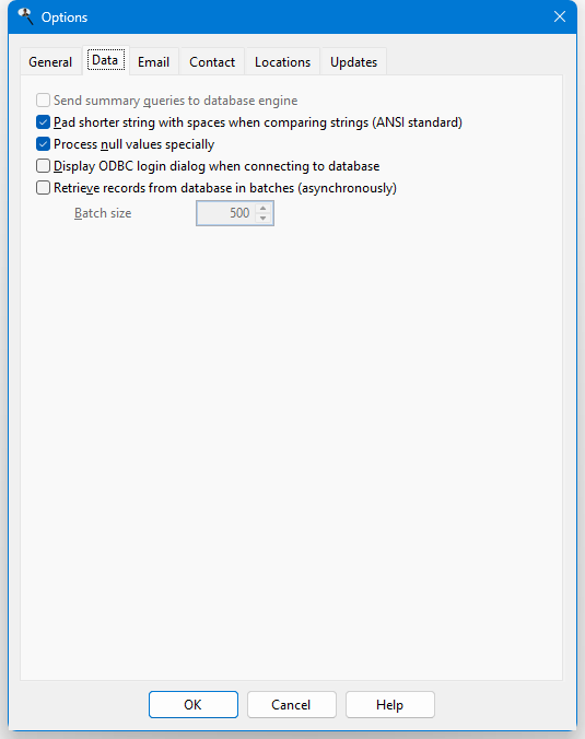 Retrieve records from database in batches (asynchronously): if this option is turned off, Stonefield Query retrieves the entire set of records it needs for a report from the database at one time. While this is great for performance, it also means that you cannot stop a report run while the records are being retrieved. If there are a lot of records, you may have to wait a while before pressing Esc or clicking the Cancel button stop the report run. Turning this option on tells Stonefield Query to retrieve records in batches and check for Esc or Cancel between each batch. This gives you the ability to stop the report sooner. If you turn this on, you can set the batch size, which is the number of records to retrieve at one time. Larger values give better performance but also mean you have to wait longer between pressing Esc or clicking the Cancel button and Stonefield Query stopping the report run.