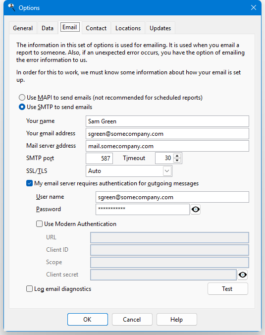 Test: once the email options are set, click this button to send a test message to yourself. This allows you to ensure the email settings are correct.