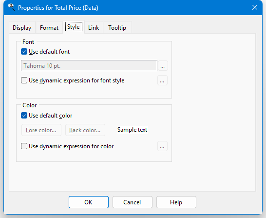 • Fore color: the foreground, or text, color for the contents of the field. The default color is the color used in the template for the report; to change it, click this button and select the color from the Color dialog that appears. The sample text show what the field looks like in the report.