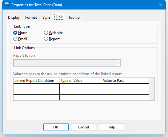 • Values to pass: this option, which is only available if Link Type is set to Report, allows you to pass values to the ask-at-runtime filter conditions of the linked report. Without this option, when you click a field linked to another report, that report will prompt you for any of its ask-at-runtime filter conditions, which may not make sense. For example, suppose you have a customer report and you've linked the company name field to a report showing sales by customer. The linked report has an ask-at-runtime filter condition on the customer number, so when you click a particular company name, the linked report runs and asks you for the customer number. That seems odd, because you just clicked a particular customer and now it wants you to specify which customer. To make this more seamless, you want to tell the linked report which customer you just clicked. You do that by specifying what value to pass to the ask-at-runtime filter condition of the linked report. In this case, you'd specify that the customer number should be passed to the linked report. Since that value is passed, the report doesn't need to ask you for the customer number, and simply displays the sales for the customer you clicked.