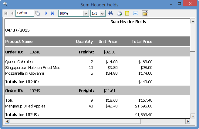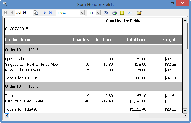 Because Stonefield Query sums fields for each line in the detail band, header fields are summed multiple times. For example, the freight for order 10248 is $32.38 but because it's summed, it's added up three times (once for each order line) to give a total of $97.14, which is incorrect. The grand total at the end of the report is also many times higher than it should be.