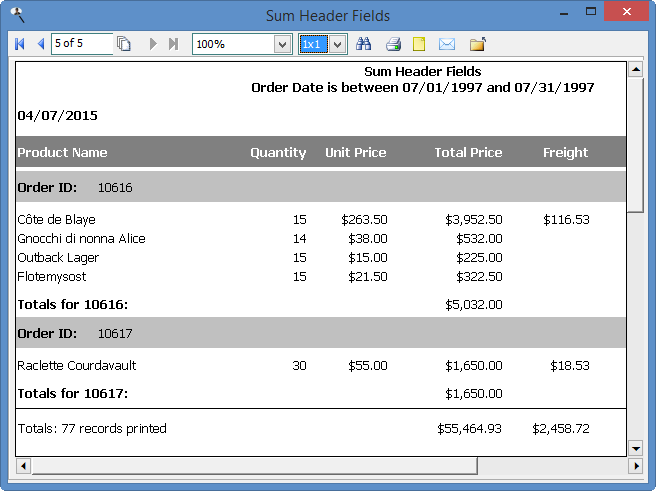 _vfp.SetVar('FreightTotal', FreightTotal + Freight)This tells the report engine to add up the freight amounts only when the group (in this case, the order number) changes. Double-click the Freight field and set Print repeated values to No on the Print When page. Finally, add a new field to the Summary band with FreightTotal as the expression. Here's the result: the Freight amount is only shown once per order line and has a total at the end of the report.