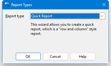 Quick report: a "row and column" style report. This is the most common type of report in Stonefield Query.