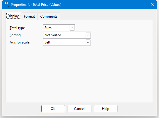Axis for scale: this option, which is only available for values fields, specifies whether the left or right axis is used for the scale for this field. This is normally set to Left but if you use more than one values field, you may want to set one of them to Right, especially if the range of values is significantly different between the fields.