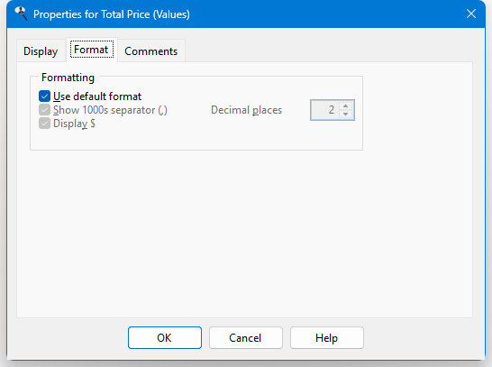 The options in the Format page of this dialog, which only appears for values fields, are: