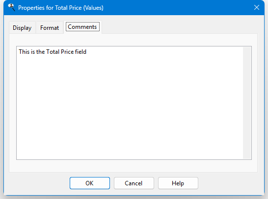 The Comments page shows any comments about the field, which is often used to provide a description of the field's contents.