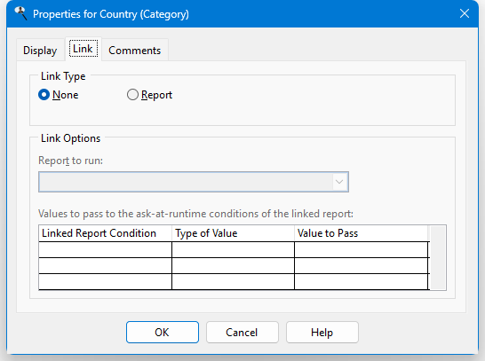 Values to pass: this option allows you to pass values to the ask-at-runtime filter conditions of the linked report. Without this option, when you click a category linked to another report, that report prompts you for any of its ask-at-runtime filter conditions, which may not make sense. For example, suppose you have a chart showing sales by country and you've linked the country field to a report showing sales for that specific country. The linked report has an ask-at-runtime filter condition on the country name, so when you click a country in the chart, the linked report runs and asks you for the country name. That seems odd, because you just clicked a particular country and now it wants you to specify which country. To make this more seamless, you want to tell the linked report which country you just clicked. You do that by specifying what value to pass to the ask-at-runtime filter condition of the linked report. In this case, you'd specify that the country should be passed to the linked report. Since that value is passed, the report doesn't need to ask you for the country name, and simply displays the sales for the country you clicked.