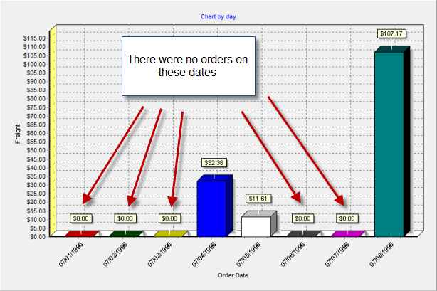 Add missing date values: if this option, which is only available for date fields used as categories, is turned on, missing values are automatically added to the chart, and the range of those values respects any date filter you use. For example, in the following chart, the only dates that had orders were 07/04, 07/05, and 07/08, but the filter condition was Order Date is between 07/01/1996 and 07/08/1996, so all days between those dates appear whether they had any orders or not: