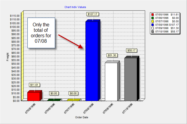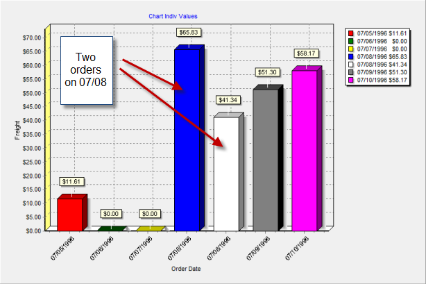 Set Total type to None if, instead of displaying summarized values, you want individual values charted. For example, the following chart has Total type set to None, so you can see two orders on 07/08: