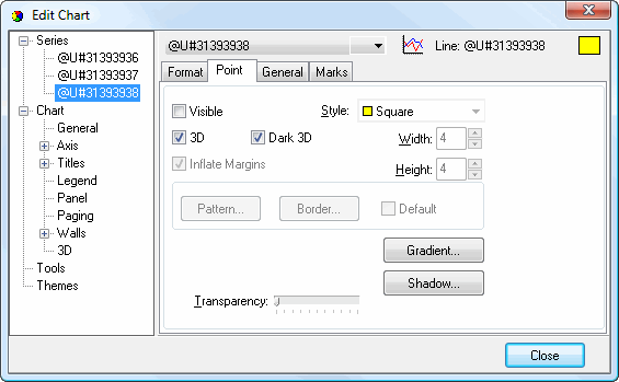 There are four pages of settings for line series: Format, Point, General, and Marks. Some of these have several subpages of settings on them.