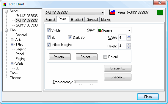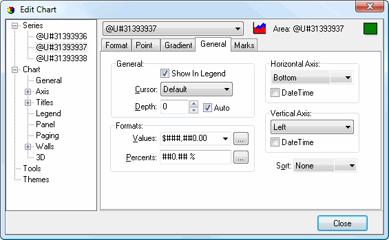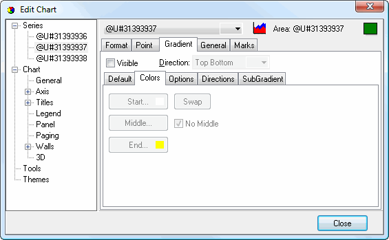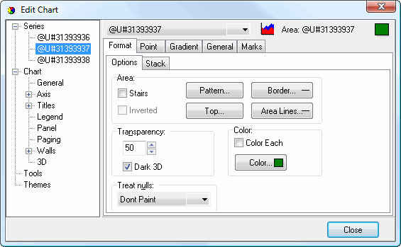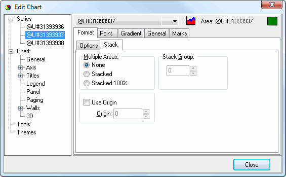 There are five pages of settings for area series: Format, Point, Gradient, General, and Marks. Some of these have several subpages of settings on them.