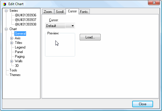 The Cursor subpage has the following options, which affect the shape of the mouse pointer when it's over the chart: