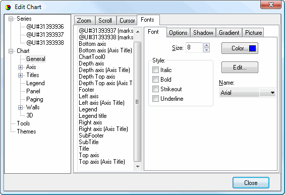 The subpages of the Fonts subpage allow you to quickly change the font settings for various objects, such as the Legend, Legend Title, and Title. The Font subpage of the Fonts subpage has the following options: