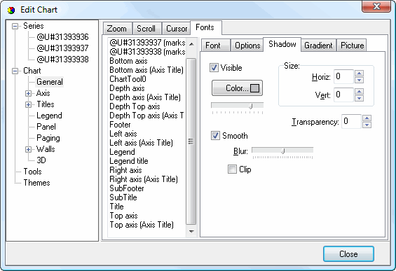 The Shadow subpage of the Fonts subpage has the same options as the Shadow Editor dialog.
