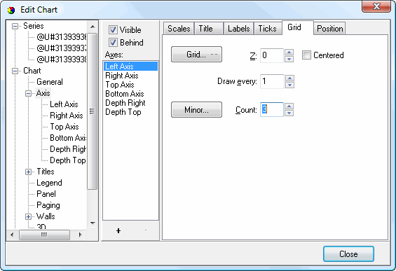 • Behind: this option determines whether the gridlines for the selected axis appear in front of (turned off) or behind (turned on, the default) the items in the chart.