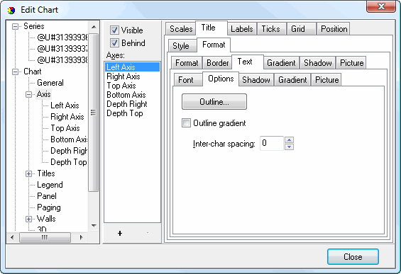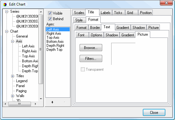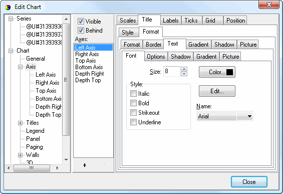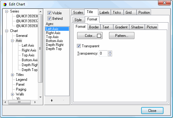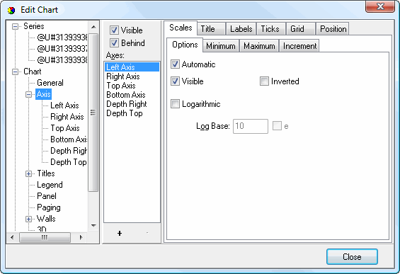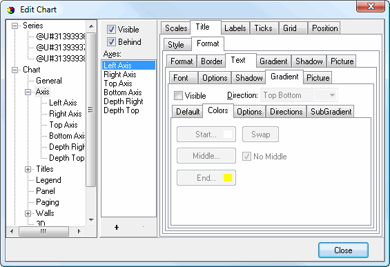 • Visible: this option specifies whether any of the attributes of the axis, such as the labels, title, and gridlines, appear or not.
