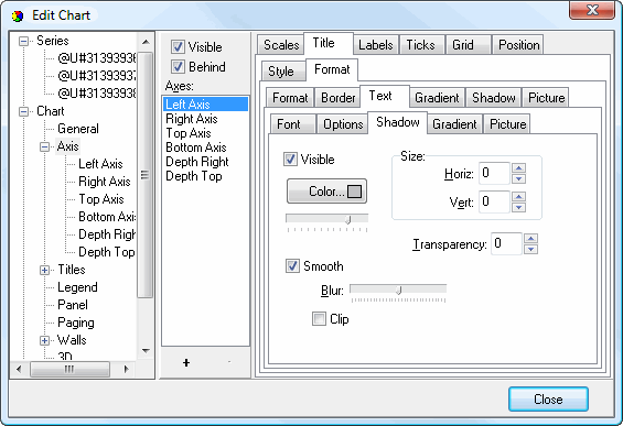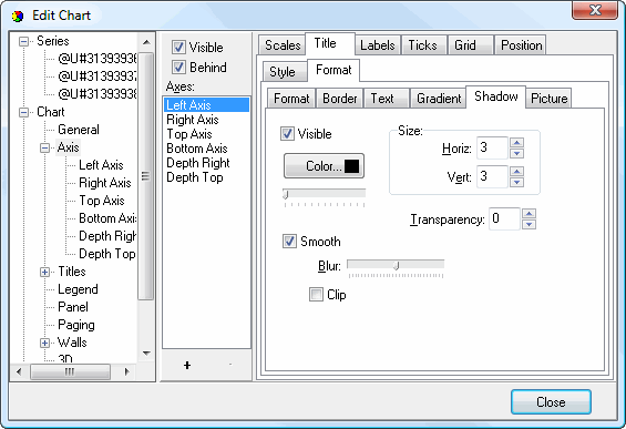 The Shadow subpage of the Format subpage of the Title subpage controls the shadow for the shape in which the title appears. It has the same settings as the Shadow Editor dialog.
