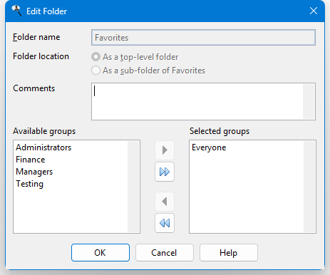 Selected groups: this shows which user groups have access to this folder. By default, the Everyone group has access to a folder, so all users can see it. If you want only certain users to see it, remove the Everyone group from the Selected list and add the appropriate groups from the Available list.
