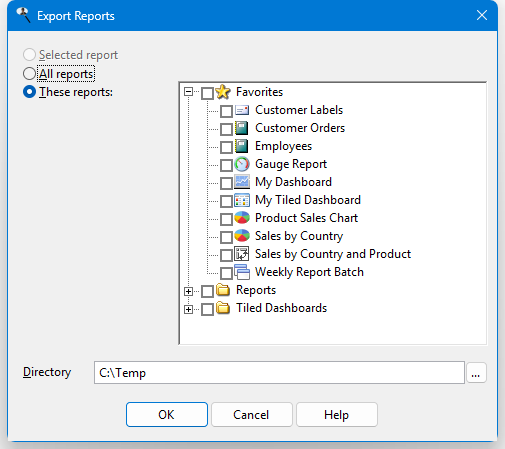 These reports: choose this item to indicate that you will select certain reports. The list of reports at the right is then enabled, allowing you to select which reports to export by turning on the checkmark in front of the desired report names. To select all of the reports in a folder, turn on the checkmark in front of the folder name; turning the checkmark off deselects all of the reports in the folder.