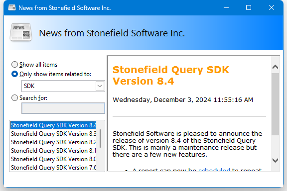 News announcements about Stonefield Query are published occasionally. If you use an RSS feed reader, you can automatically receive these announcements by subscribing to http://blog.stonefieldquery.com/feeds/posts/default. However, Stonefield Query has its own built-in news reader, making it convenient to receive announcements.
