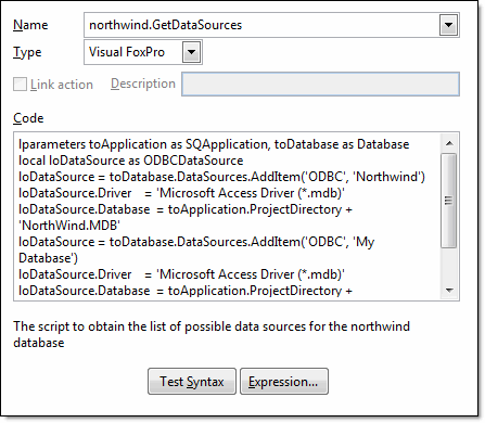 • Data object: These scripts are specific to a database or table, and are preceded by the database or table name; for example, "Northwind.GetDataSources" is the name of the GetDataSources script for the Northwind database.