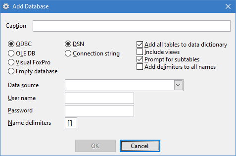 DBCX metadata: if you have a set of DBCX metadata (for example, if you use Stonefield Database Toolkit) for your data, choose this option and select the DBCXREG table for the data.