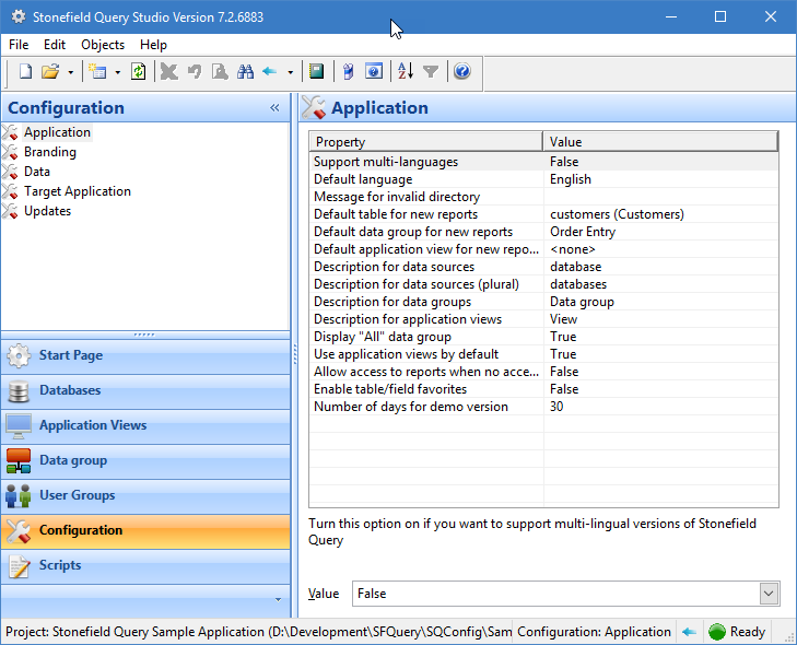 Configuration settings are maintained with the Configuration panel in Stonefield Query Studio. To change the value for a setting, select the appropriate category in the Configuration panel, click the setting you wish to change in the list in the properties pane, and enter the new value in the control at the bottom. Some settings, such as Support Multi-Languages and Default Language, have a pre-defined list of settings you can select from the drop-down list. You can also double-click the setting in the list to toggle the value to the next one listed in the drop-down list.