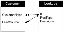 The Customers table has a foreign key called CustomerType that contains the ID value for a record in Lookups representing the customer type, and another foreign key called LeadSource that contains the ID value for a record in Lookups representing how they became a customer. Thus, Lookups contains two different types of records: customer types and lead sources. The RecType column in Lookups contains a "C" for customer type records and "L" for lead source records.