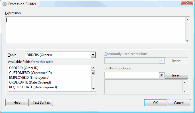 Available fields from table: a list containing all reportable fields from the table shown in the Table list. To add a field to the Expression text box, double-click the desired field or select it and press Enter. The field is added at the current cursor position in the Expression text box.
